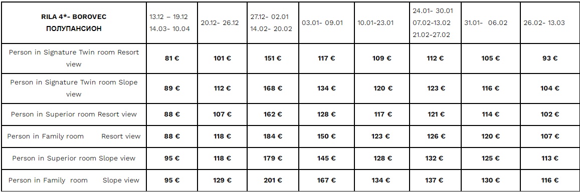 Во цената е вклучено : појадок и вечера по лице на ден, користење на внатрешен базен 25м, џакузи, сауна, парна бања, турска бања, cryo cabin, релакс соба, фитнес, интернет, паркинг, детско катче (15ч-23ч) и игротека за деца од 3-7г (бесплатно 2 часа во екот на денот), ски гардероба.