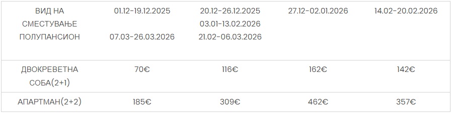 Цените се за 1 ноќевање со појадок и вечера за 1 лице во двокреветна соба/ за 2 лица во апартман.